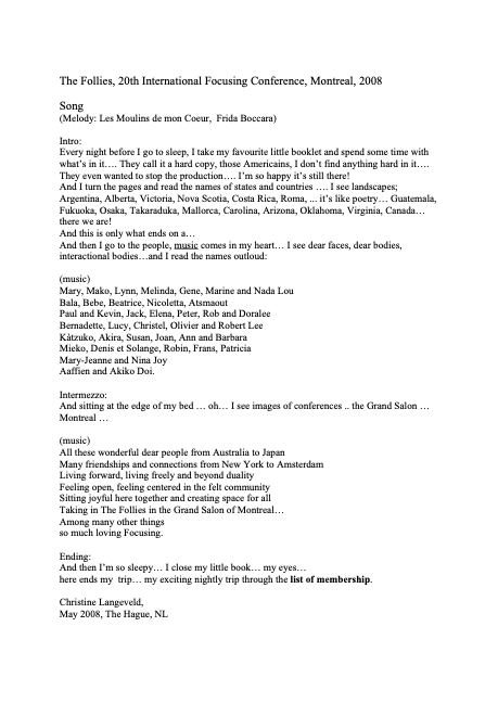 At my third international Focusing conference in Montreal in 2008, Christine wrote and performed a charming and delightful song inspired by …….. reading the list of Focusing Institute members around the world. Until recently, that “little book” was published every year and sent to the members. Now there are so many members, the little book has become too big to print and send to everyone. Now, people use focusing.org to find member contact information.
